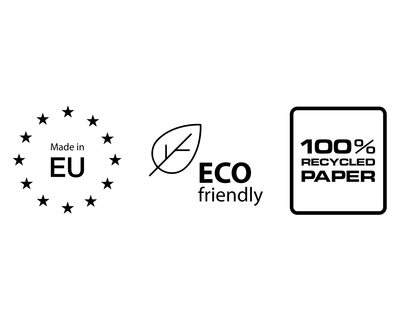 • Umwelt- und Herkunftslabels: Made in EU, Eco friendly, 100% Recyclingpapier